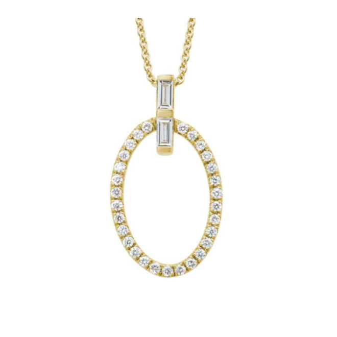 14K yellow gold pendant with oval shaped drop with a baguette diamond bail.