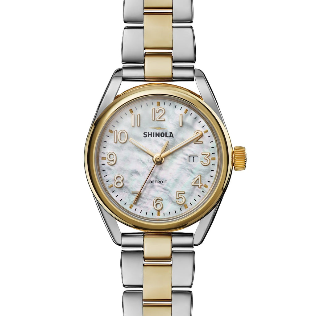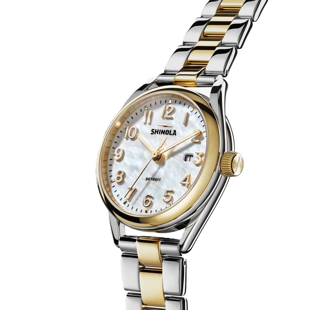 Front and center: The two-tone polished stainless steel case that wraps elegantly around the clean and open Mother of Pearl dial. It’s a seamless design executed with fresh inspiration from American design heritage. Slim hands and applied indexes on the dial complete the style. Derby is no show pony—it’s built to last, with a design that thinks in decades, not seasons.
